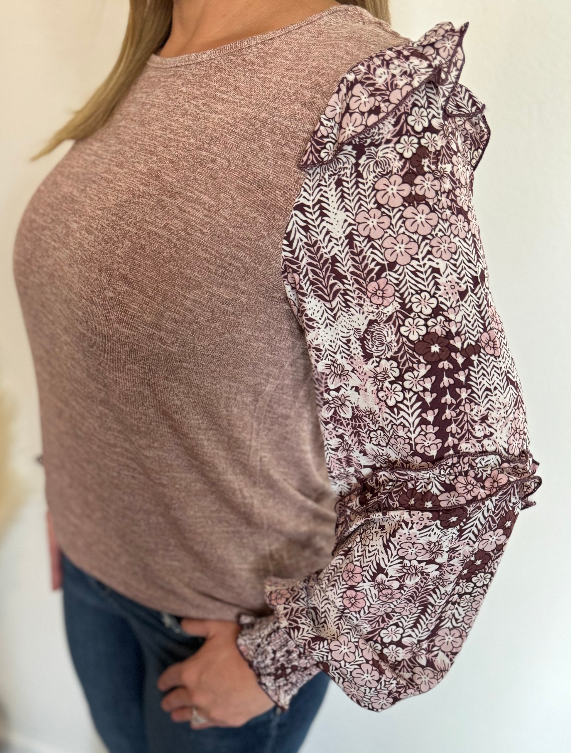 Chestnut Ruffle Tiered Floral Sleeve Blouse
