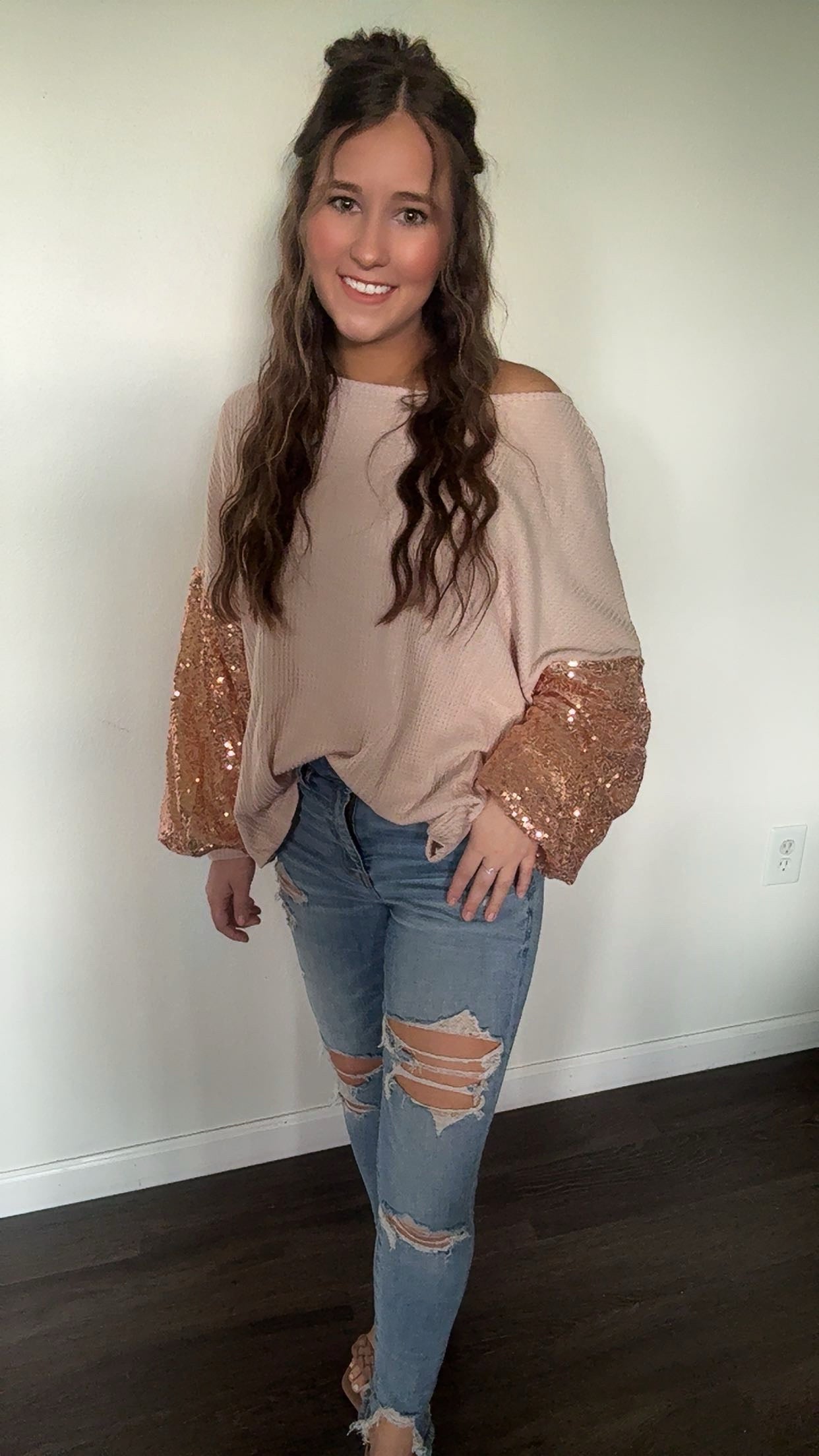 Sequin Patchwork Sleeve Open Back Waffle Knit Top